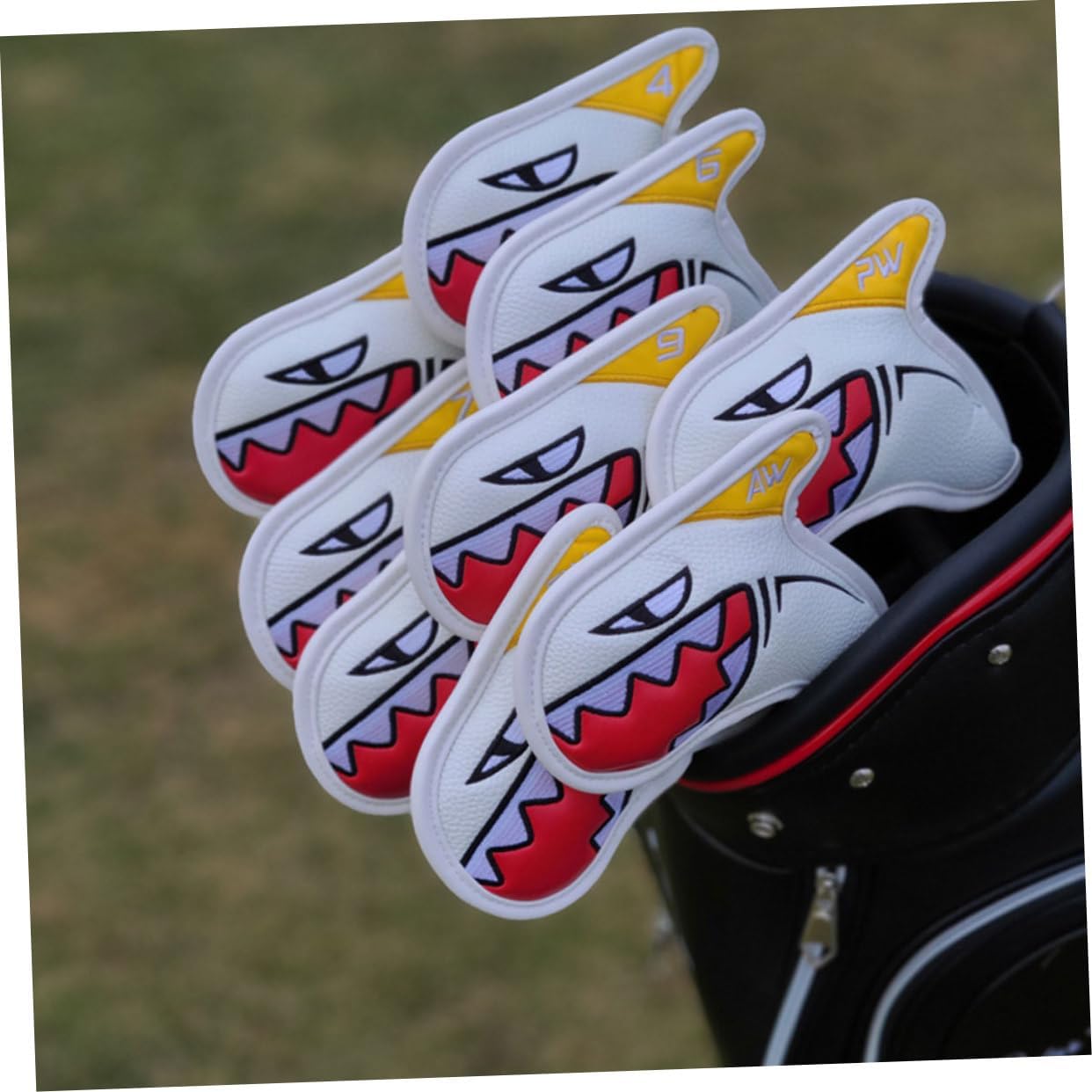 Package List 9 x Putter Covers Features -Material: PU Golfs Supply -Product Info:Golf club cover -Made of , the club cover is durable and use golf irons cover. -Designed to fit most clubs, and protect them from the dings and damage that occur during play or travel golf iron sleeve. -Mallet shaped putter cover keeps your golfs investment safe while club is being stored, carried in your bag, or being transported on the course covers for golf clubs. -It can reduce vibration, to ensure the putter covers do not fall off and well stitched Convenient Club Cover. -Prevents damage to clubs during transport. Great gifts for friends who love sports Club Cover.Goods Descriptiongolf is not only helpful for sports, but also a great gift for your friends and family who like golfs.golf iron covers It can provide maximum from damage due to the clattering of clubs with each other.golf accessories The adorable pattern design shows its usefulness and your attitude towards life
