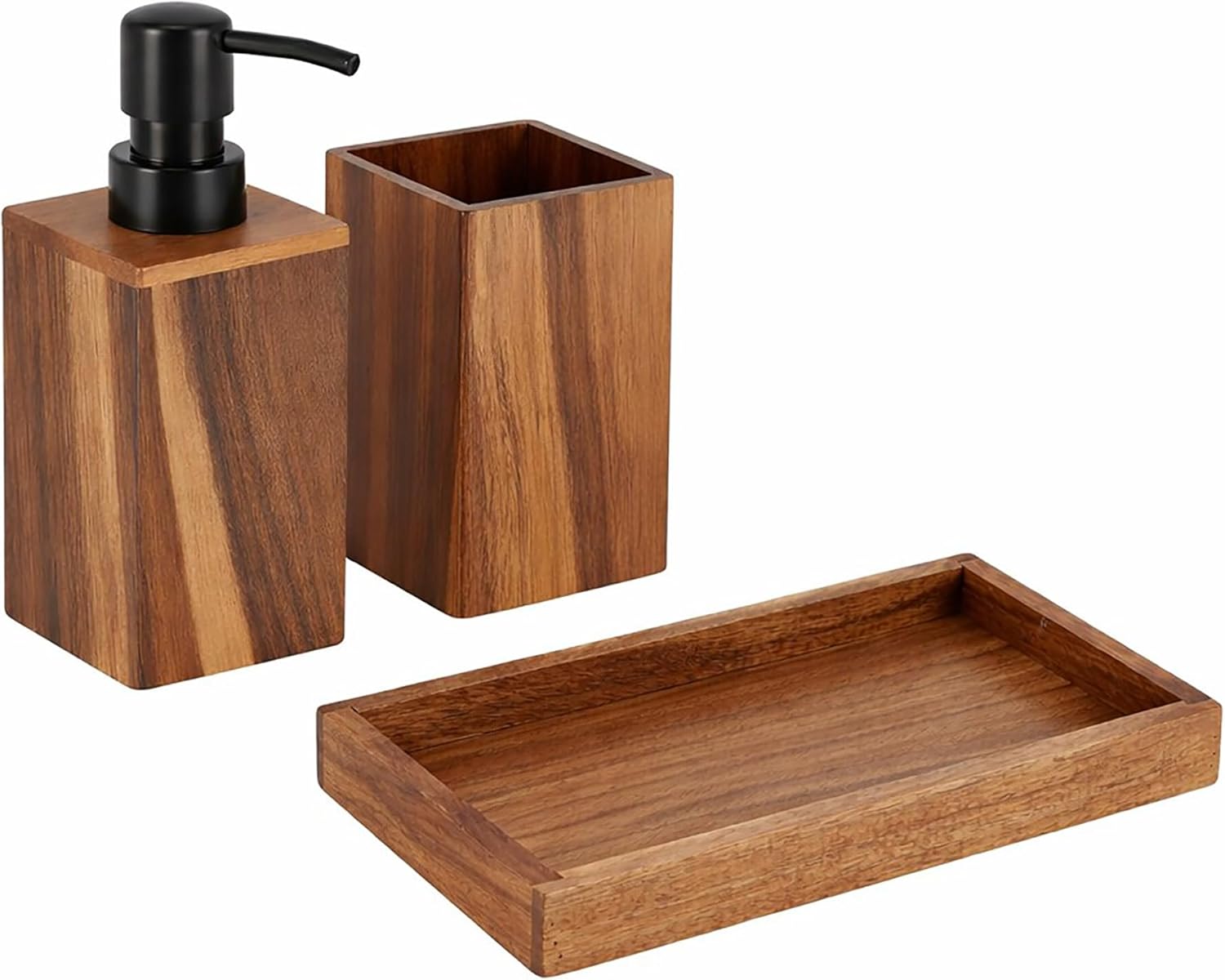 • NATURAL DESIGN: With its unique style, this Acacia bath accessory set 3 pieces rectangular brings a farmhouse touch to your bathroom. This is the perfect complement to any bath or kitchen counter