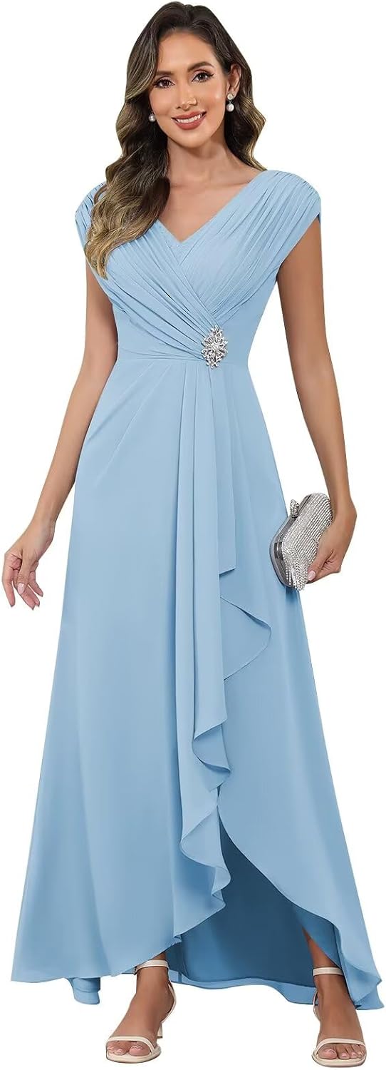 Fabric: Chiffon Mother of The Bride Dress. Silhouette: A Line Wedding Guest Dress. Back Closure: Lace-up, Drawstring, Corset Evening Dresses. Neckline: V Neck Mother of The Groom Dress. Sleeve Style: Cap Sleeve Bridesmaid Dresses. Hemline: Tea Length Grandmother of The Bride Dresses. Features: Chiffon Mother of The Bride Dresses with Sleeves, V Neck Ruffles Beaded Ruched A Line Long Formal Dress. Occasions: Perfect as mother of the bride dresses, mother of the groom dresses, bridesmaid dresses, prom dresses, evening dresses for women, wedding guest dress, pageant dress, engagement dress, homecoming dress, cocktail dress, black tie dress, festival, birthday, holiday, party ball gowns. Perfect for other formal or semi-formal special occasions. Size: To ensure the dress will fit you, please check detailed measurements on the size chart and choose the right size. (Size chart follows dress images.) If you want the dress to be customized, please send us below measurements. 1.Bust ___ inch or ___ cm 2.Waist ___ inch or ___ cm 3.Hips ___ inch or ___ cm 4.Height (barefoot) ___ inch or ___ cm 5.Shoulder to floor (barefoot) ___ inch or ___ cm 6.Heels ___ inch or ___ cm (or flats) Warm Tips 1.The real color of the dress may be slightly different as the computer screen is different. 2.Please allow 1-3cm differs due to manual measurement.