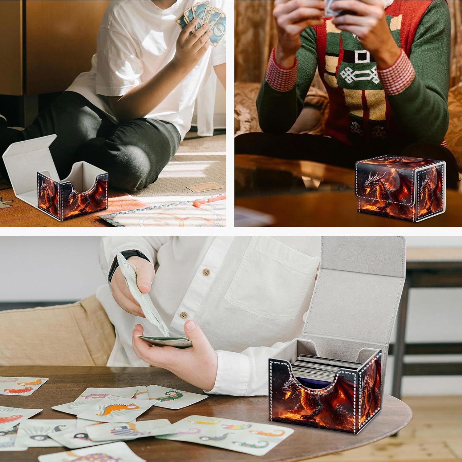 • ✨【Magnetic Closure】The box's lid is equipped with 4 hidden magnetic buckles for a secure closure. The tight stitching and strong magnets ensure that the box remains tightly sealed even when flipped upside down, providing optimal protection for your valuable cards while also being user-friendly.