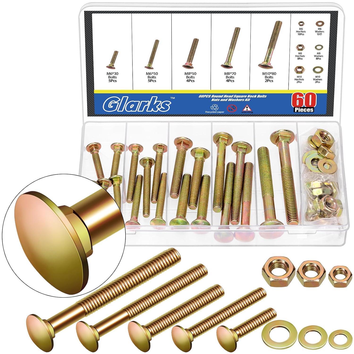 Glarks 60pcs M6 M8 M10 Carriage Bolts Screws, Round Head Square Neck Bolts, Square Neck Carriage Bolts Screws with Nuts and Washers for Machinery Industry