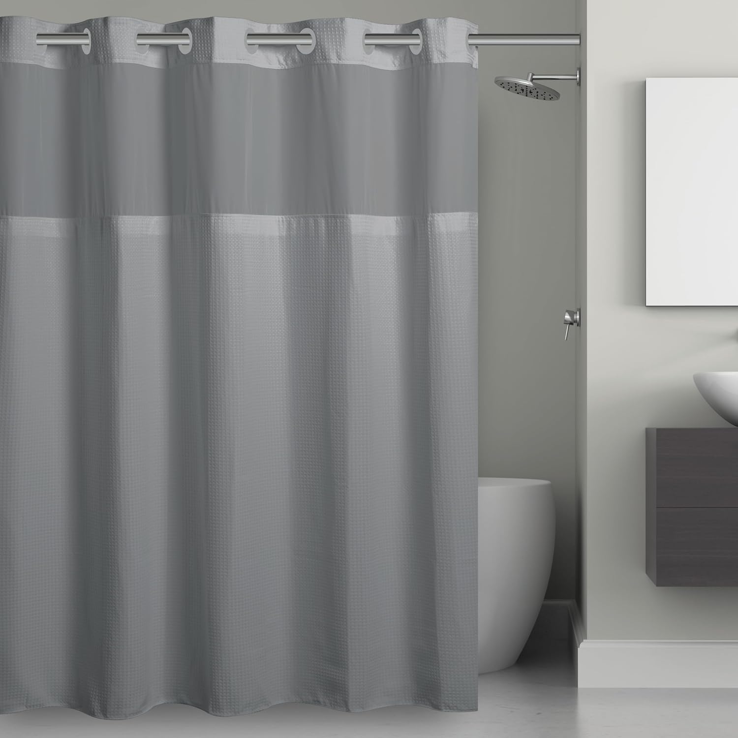 • SHEER WINDOW DESIGN – Our hookless shower curtain with snap-in liner includes a sheer viewing window that welcomes natural light into your shower enclosure while maintaining privacy. This translucent panel also reduces humidity and moisture for an inviting shower experience