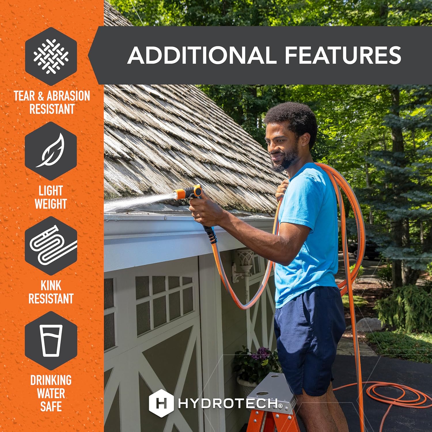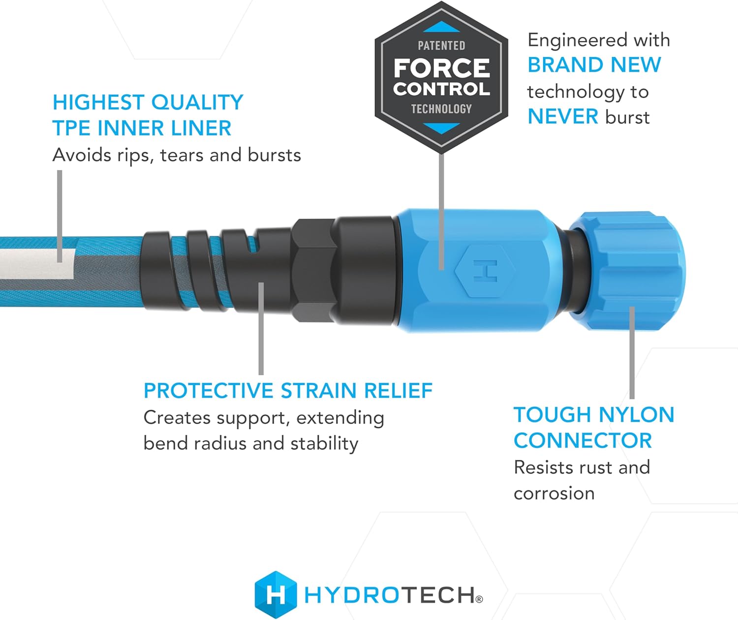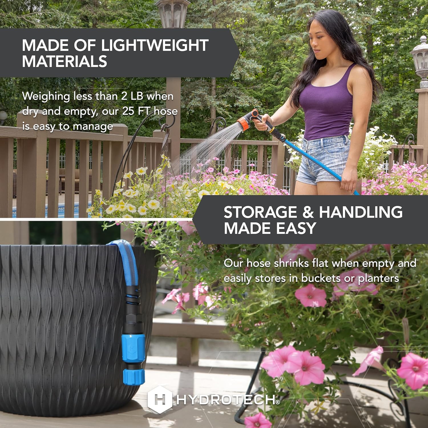 Experience the ultimate in gardening convenience with the HydroTech FlatJacket™ Hose. This 100-foot hose with a 5/8" inner core he same flow as a traditional garden hoses, is lightweight and flexible, making it easy to carry and store. No more dealing with a tangled mess before and after you work! Crafted from durable materials, this hose resists tears and abrasions due to its unique design. Enjoy reliable performance and optimal water flow thanks to Patented Force-Control Technology that protects from bursting and breaking. HydroTech hoses come in a variety of styles and lengths to fit any size garden, lawn, boat, or car. Water anything, anywhere with HydroTech.