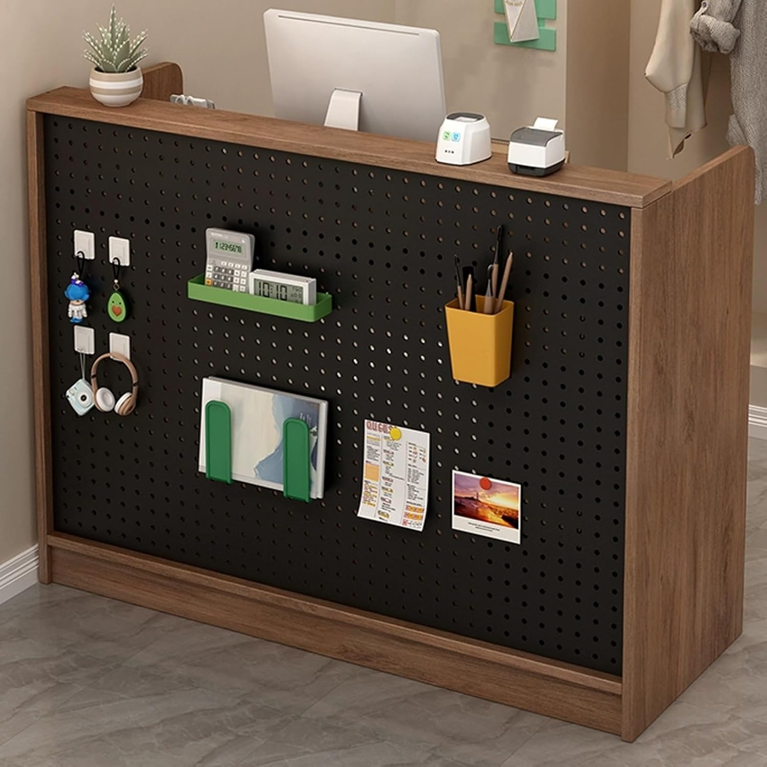 DIY perforated board with diversified storage space, large capacity and multi-zone storage, everything can be stored well.JKGHK retail counter has a wide storage table, small table + wide large table for storage, you can store anything you want.The corners of desk reception are finely polished, and the rounded design prevents bumps and injuries during work.Large capacity and diversified storage, multiple large storage layers, no matter how many items there are, there is storage space.Specifications:Color: Black , Brown , WhiteMaterial: WoodInstallation or not: YesOverall Dimensions: 60/80/100/120×40×94cm / 23.6/31.4/39.3/47.2×15.7×37inNote:1. There are only Reception Desk, other products are shooting props;2. Note: Due to the particularity of the furniture, there will be slight errors in the finished product, which is normal. The data is for reference only and must be based on the actual product. We hope for your understanding!3. While we display colors as accurately as possible, due to differences in computer monitors, colors may vary.