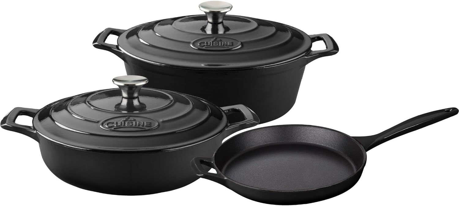 Rustle up all sorts of mouth-watering dishes with La Cuisine's PRO 5-piece enameled cast iron cookware set. This 5-piece set includes the 3.75 qt. covered saute, 6.75 qt. covered oval casserole and 10" open skillet with cast iron handles. La Cuisine's PRO cast iron cookware is crafted using sand molds, which are used only once, forging a lighter product with a very fine enamel finish that is truly unique. Wonderfully versatile, La Cuisine PRO cookware is suited to the oven and all cooktops, including induction. Food heats through evenly and remains hot until served. The non-toxic, matte black enamel interior surface is scratch-resistant, stain-resistant, and is simple to clean – just wash in warm water. Whatever your skill level, La Cuisine PRO is perfect for no-fuss, healthy cooking and looks great as it goes straight from stovetop or oven to serving at the table or buffet (our trivets, sold separately, are recommended for table/buffet use).