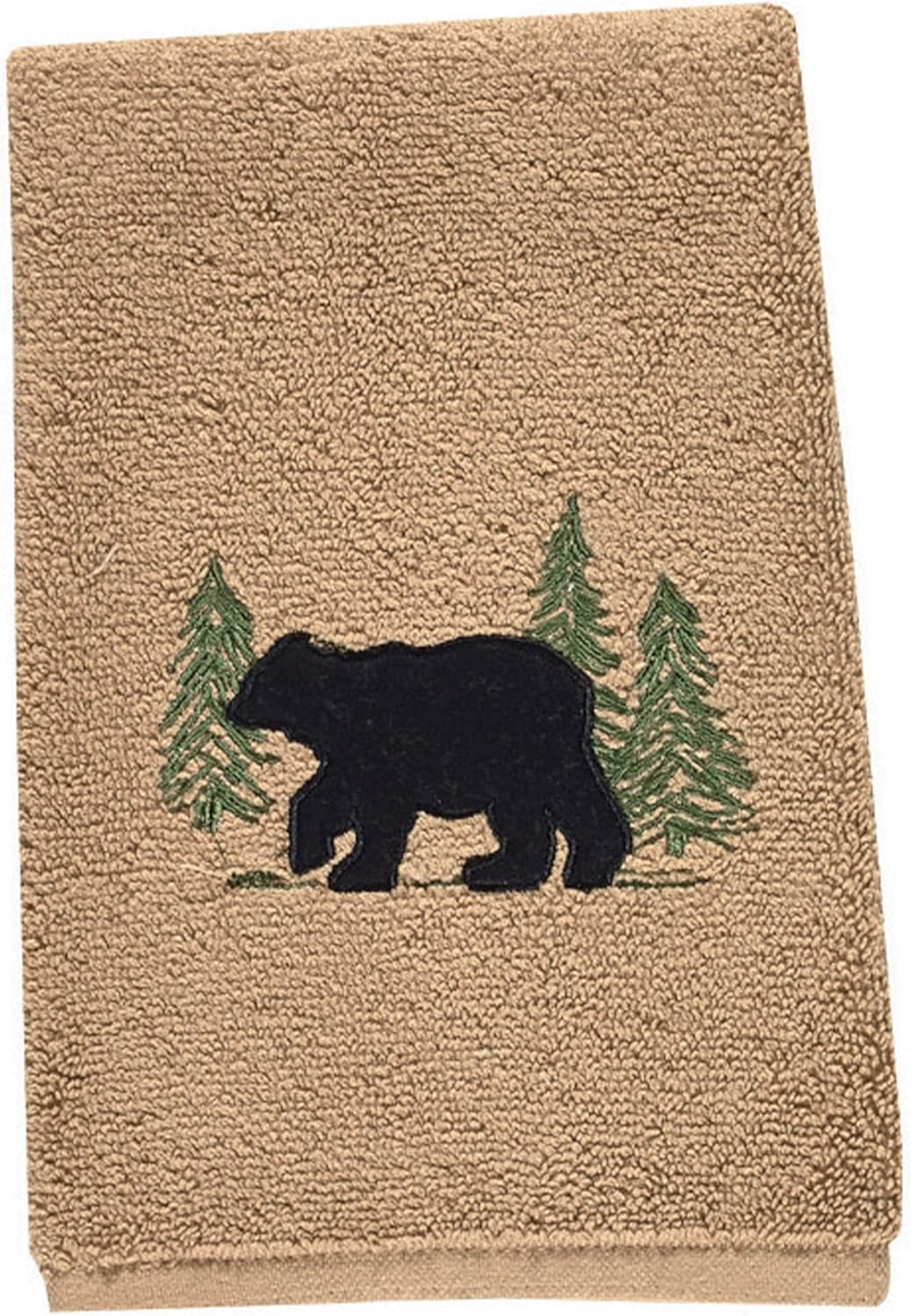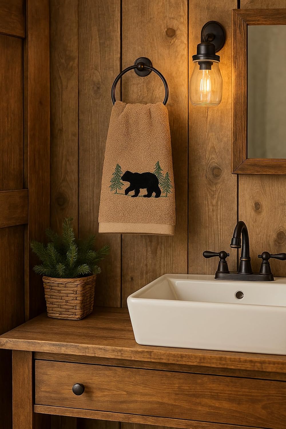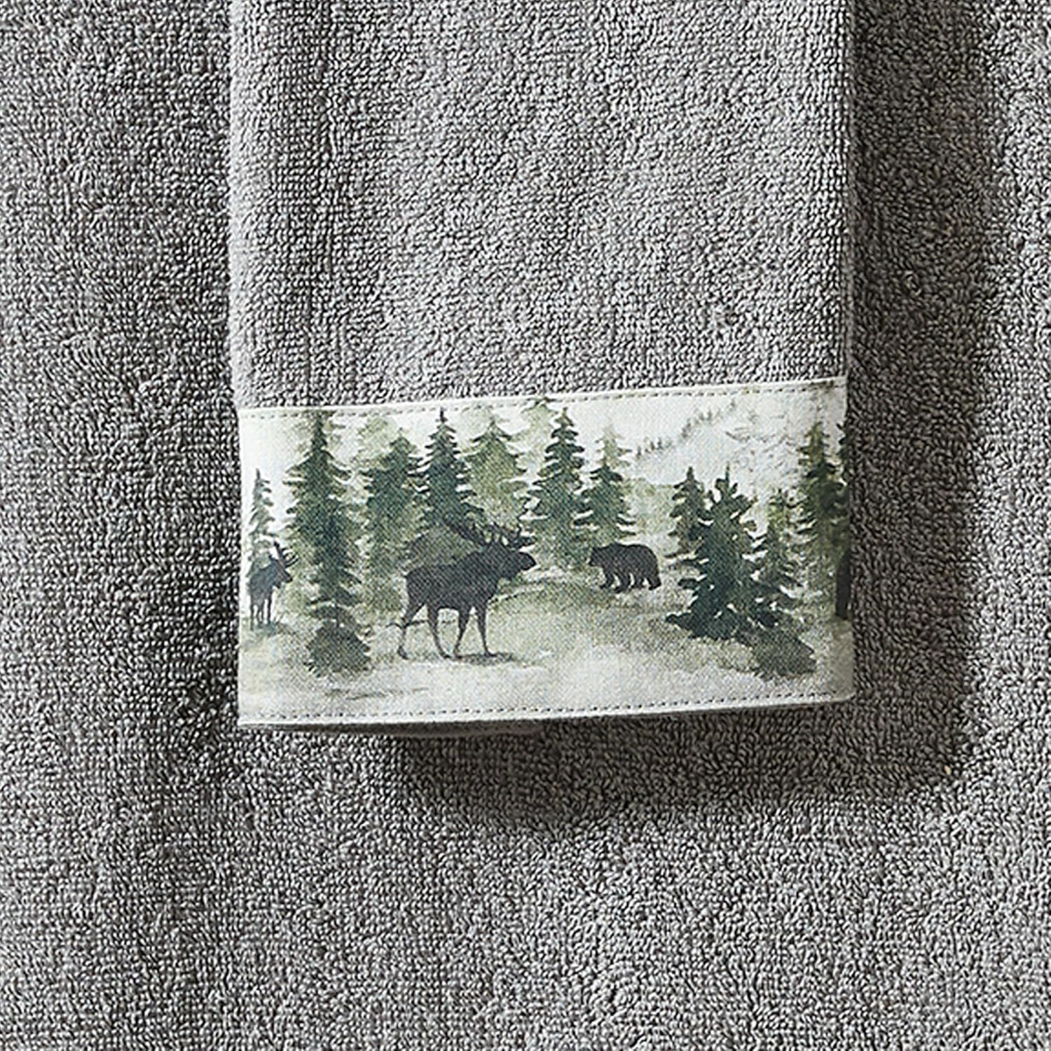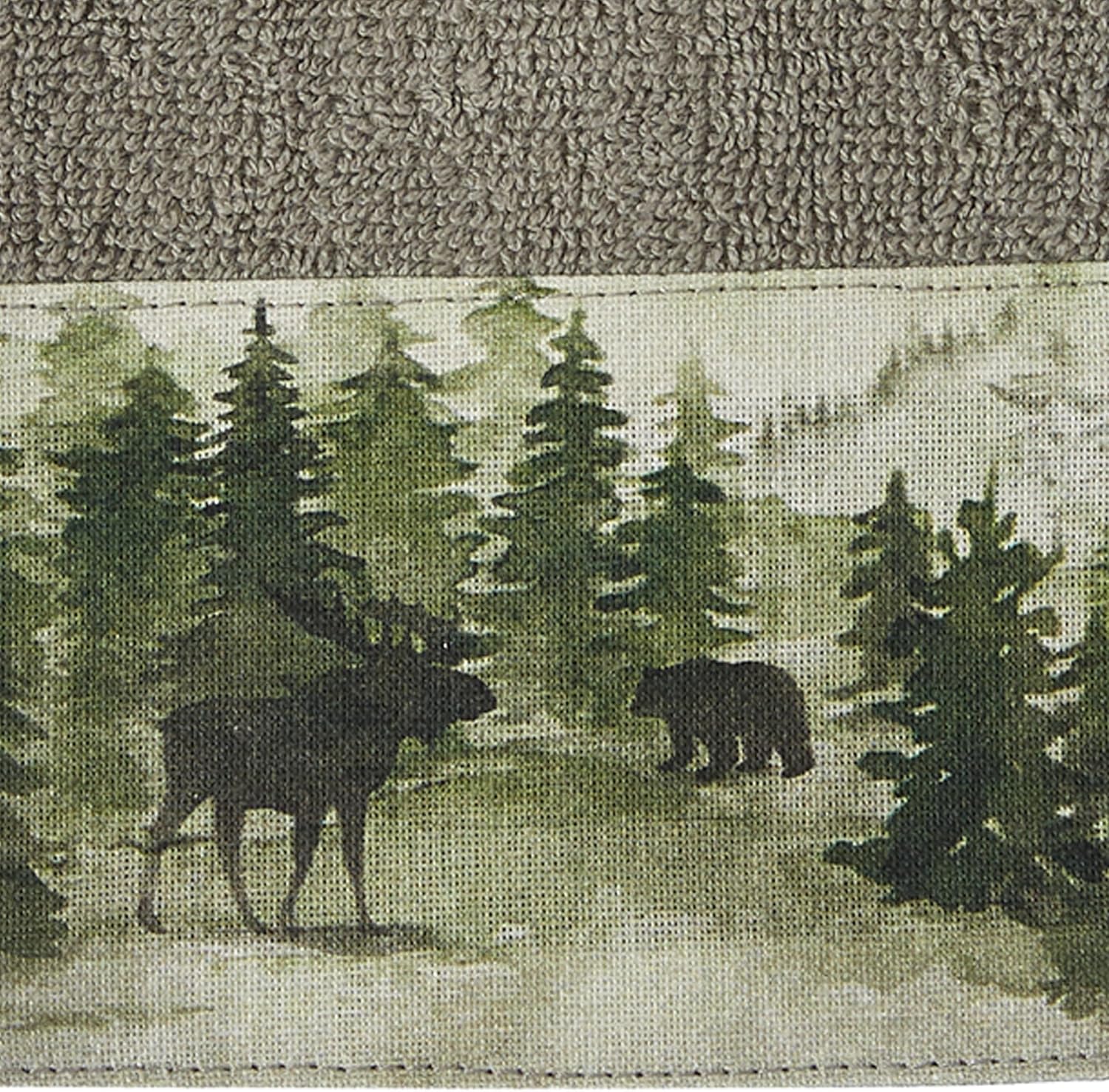 Experience the ultimate combination of comfort and luxury with our set of four plush terry fingertip towels. Whether displayed on a bathroom towel rack or draped along a kitchen sink cabinet, these cotton towels offer the perfect combination of comfort and functionality. Crafted from premium-quality materials, these thick towels are designed to provide superior softness, absorbency, and durability for everyday use. A detailed graphic by the talented artist Timothy Wilson Hoey, features a delightful trio of woodland creatures including a bear, moose, and beaver that peacefully paddle through a lake setting on a beautiful red canoe for a unique outdoorsy addition to your lodge cabin bathroom decor.