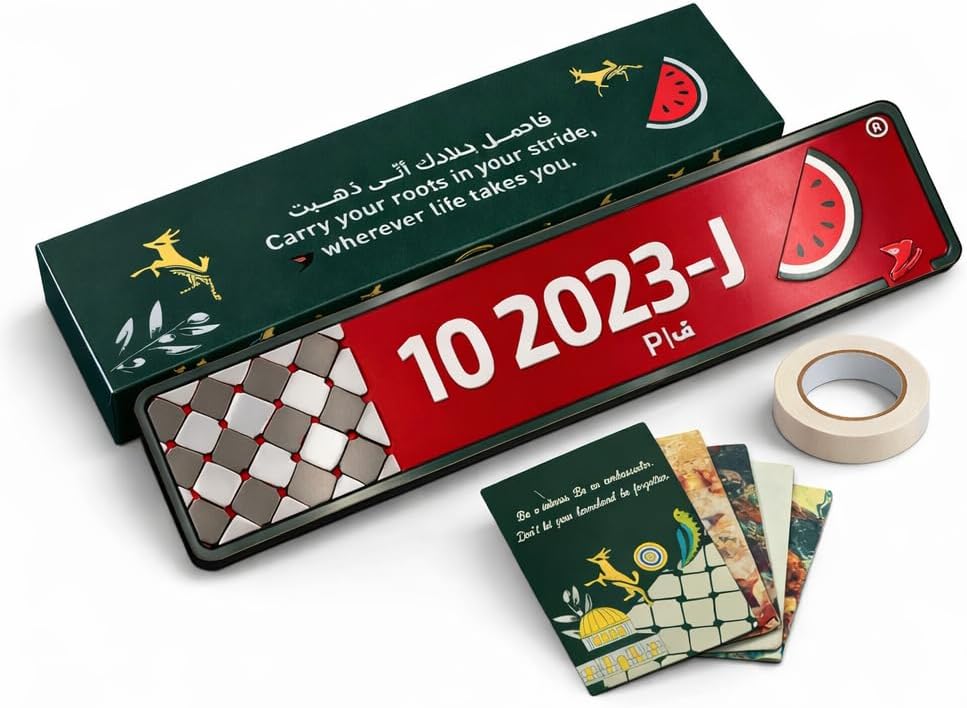 | Included Components | Aluminum Cultural Car Plate,, Powerful identity card designed with iconic Palestinian symbols a reminder to carry your story with pride. keep it or gift it as a symbol of remembrance., Premium Magnetic Gift Box with Palestinian motifs,, Strong Double-Sided Adhesive Tape, artistic card set features three meaningful designs: a couples card to celebrate love and roots, a friendship card honoring unbreakable bonds, and a wedding & new home blessing card for milestones and fresh beginnings. Each card includes space to write your own notes, making your gift more personal and heartfelt. |