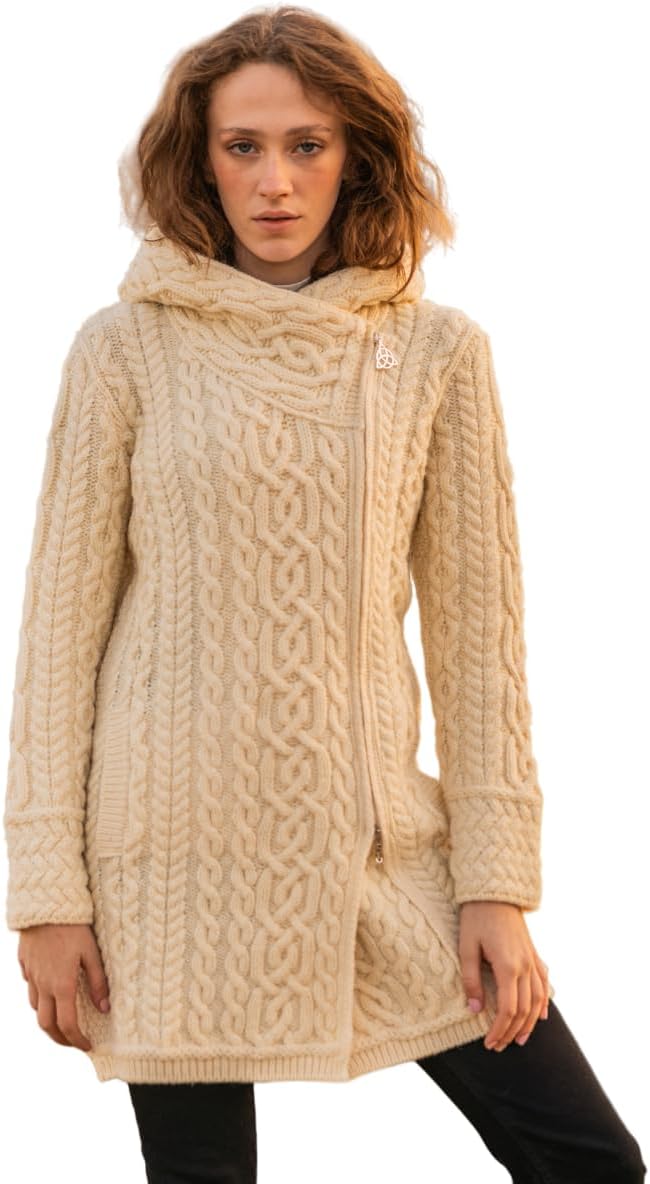 This beautiful Ladies Irish Aran Zip Cardigan is made from 100% Merino Wool and is perfect for keeping you warm and cozy on those chilly days. It features a classic Aran stitch design, a zip closure, and two front pockets for added convenience. The cardigan is also hooded for extra protection. Made in Ireland by SAOL, a company known for its high-quality Irish knitwear, this cardigan is sure to become a staple in your wardrobe.